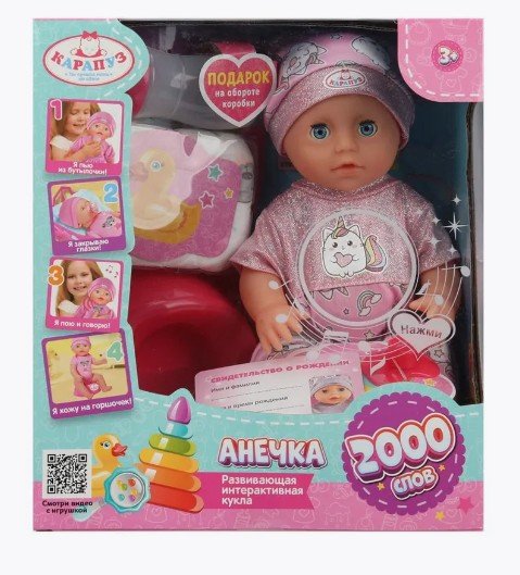Игра с «Анечкой» развивает воображение, память и внимание, а также учит заботиться о других. Пупс работает от 3-х батареек LR44 (в комплекте). Подходит для детей от 3-х лет.