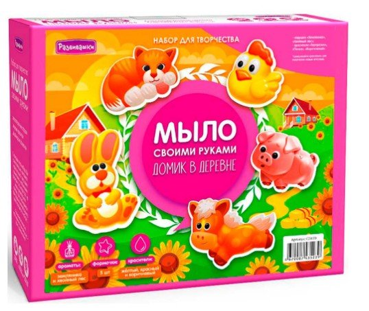 Комплектация: мыльная основа, отдушка, краситель пищевой, блестки, пластиковая форма, инструкция