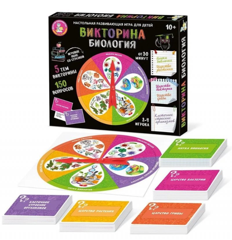 Игра настольная Викторина "Биология". Состав игры: картонное игровое поле со стрелкой (20х20 см) – 1 шт;