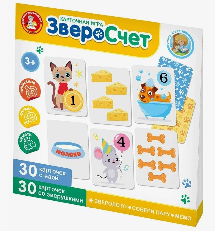 С помощью Обучающей игры для детей «ЗвероСчёт» ваш малыш в увлекательной форме освоит счет. В наборе карточки с изображением симпатичных зверушек и их еды.