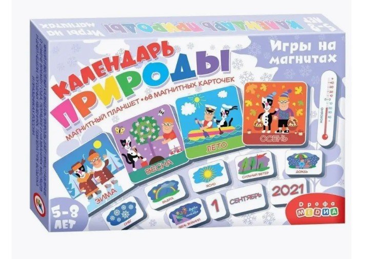 Магнитная игра Дрофа Календарь природы (3978). Магнитный планшет с карточками прекрасно подойдёт для знакомства ребёнка с изменениями, происходящими в природе. Игру можно использовать дома, в детском саду и даже в начальной школе. Оборот карточек полностью покрыт магнитным винилом, дополнительно не нужно ничего вырезать и наклеивать. Карточки отлично держатся на планшете. Планшет можно просто поставить или повесить на холодильник или магнитную доску. Наблюдайте за погодой и заполняйте с ребенком Календарь природы ежедневно. Познакомьтесь с временами года, месяцами и днями недели, узнавайте о видах погодных и природных явлений, о народных и государственных праздниках, учитесь определять температуру воздуха. В комплекте: магнитный планшет, 68 магнитных карточек, листовка с методическими рекомендациями. Размер планшета: 14x22 см. Размер самой маленькой карточки: 1,3х2 см.
